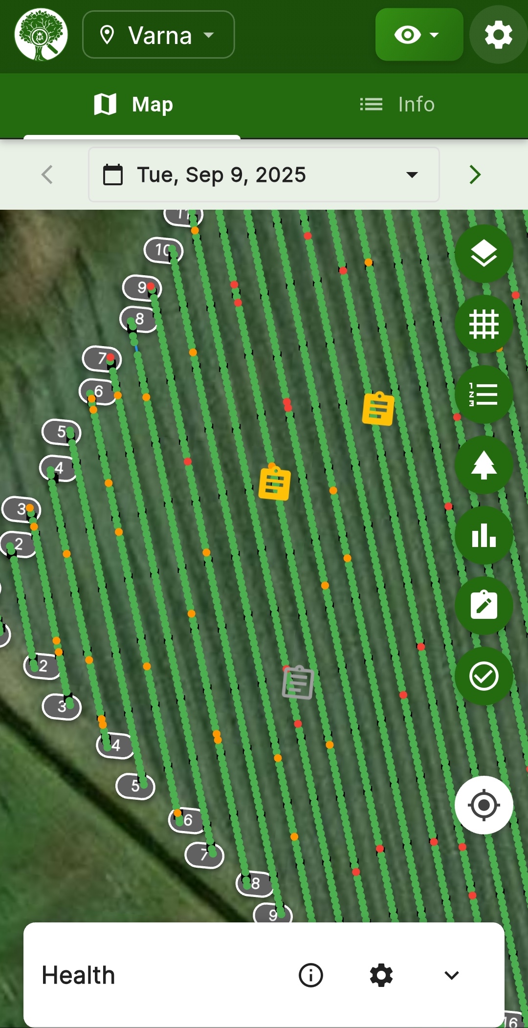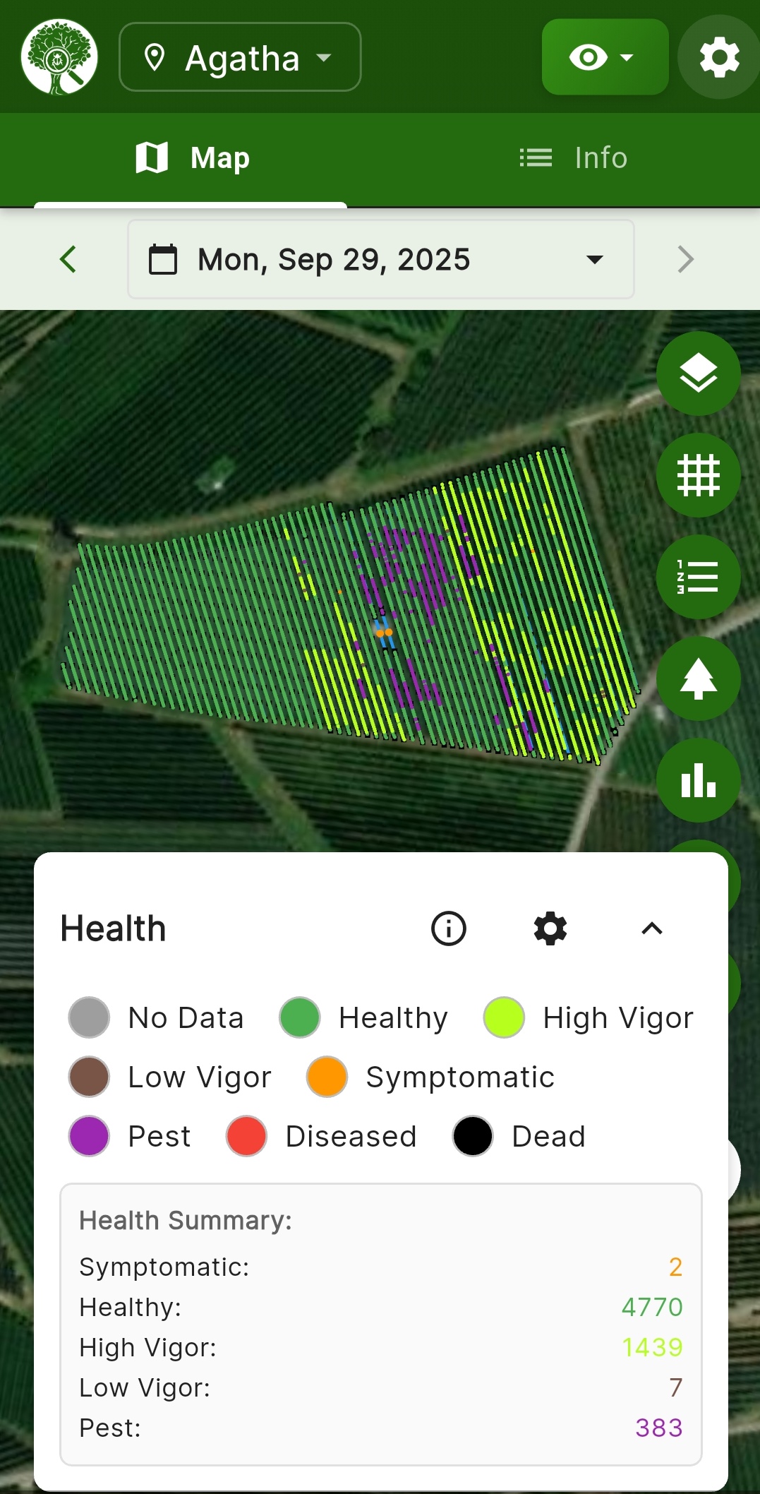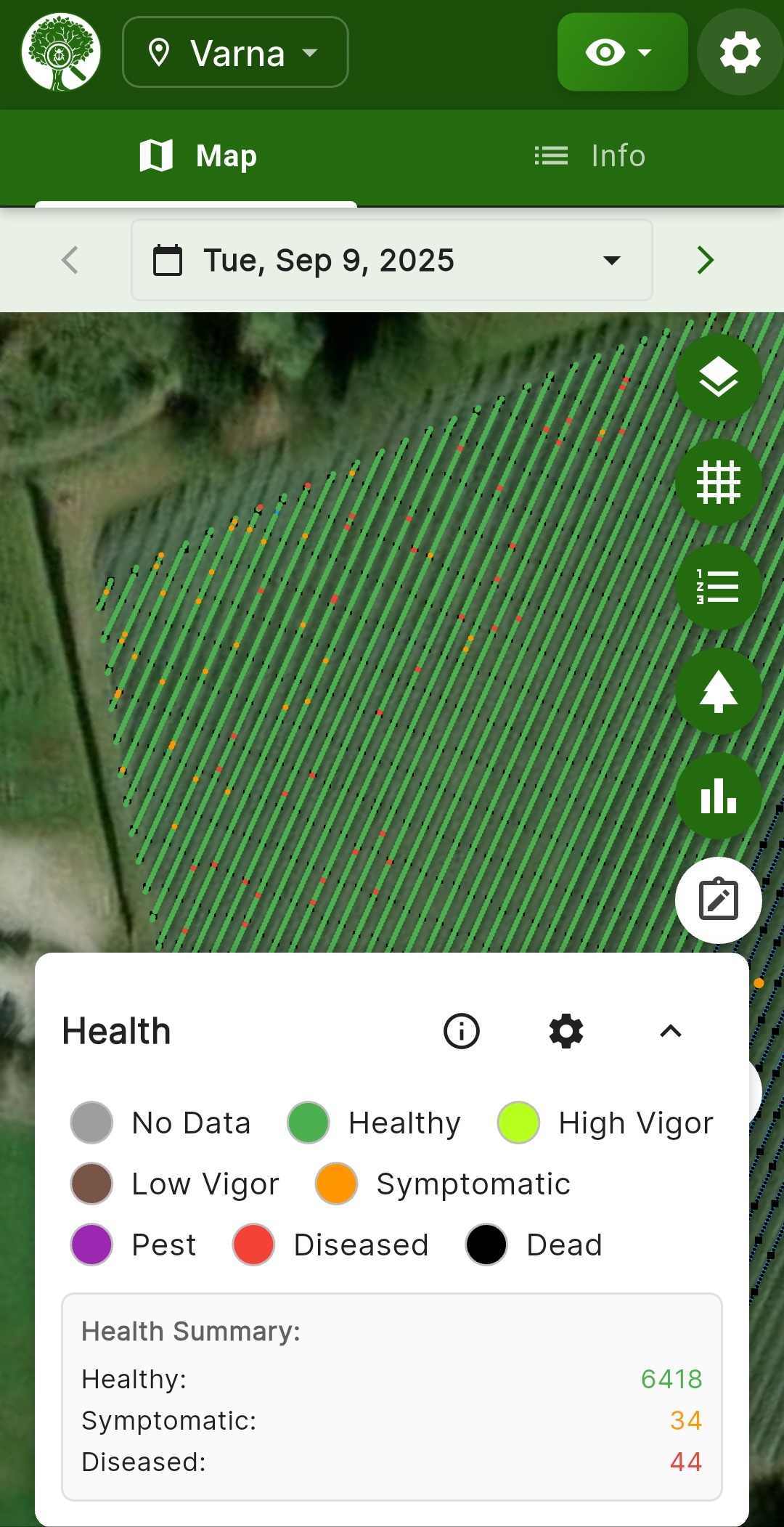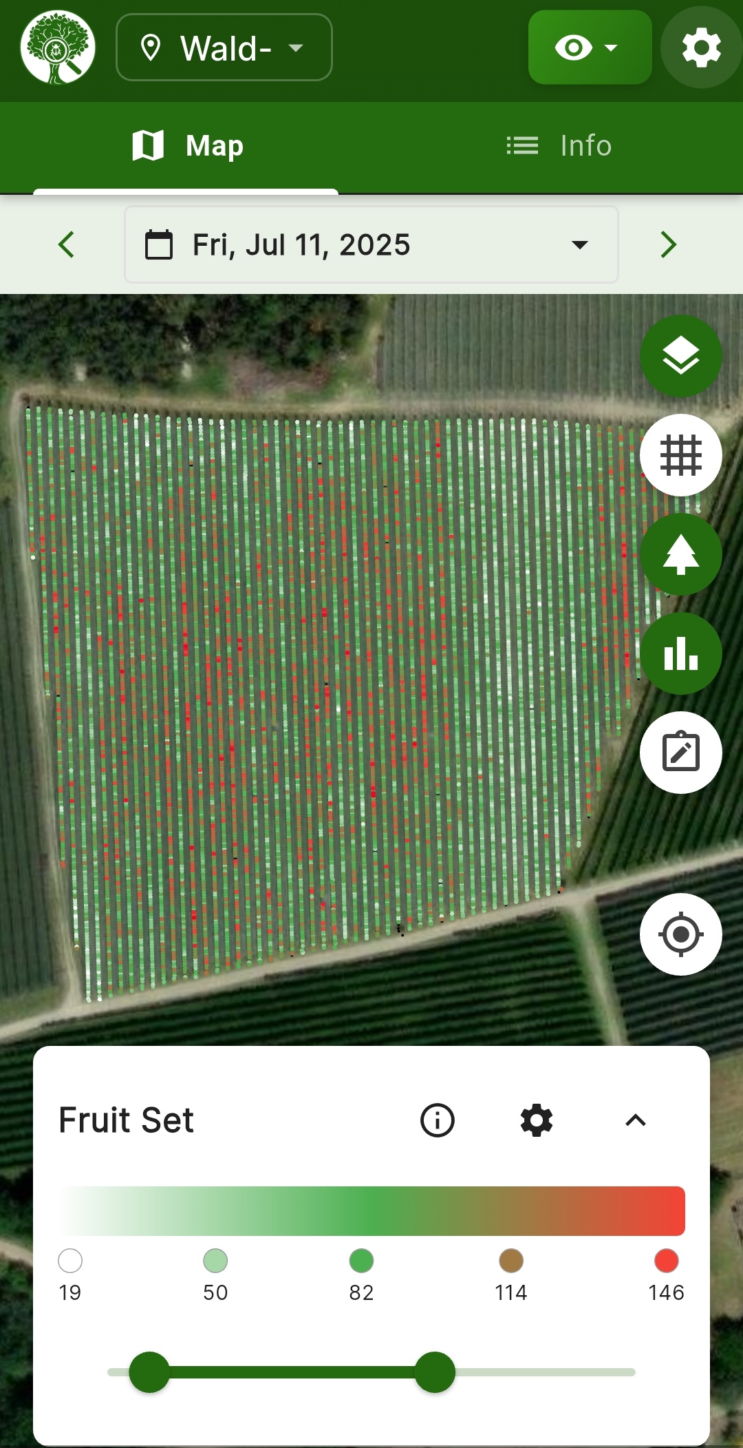 Unsere KI erkennt Blüten, Früchte, Blattmasse und weitere Parameter – und erstellt daraus präzise Karten mit baumspezifischen Informationen.